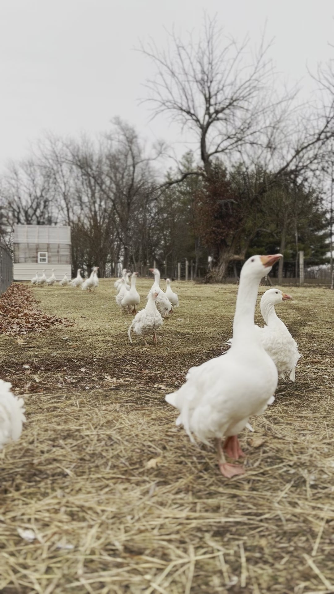 Our flock is all pure white, with one brown splashed goose. We have a flock of 21 geese total.